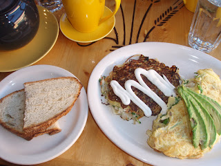 I ordered an arugula omelet with avocado on top. My side potato pancake had some other vegetables mixed in (carrots and leeks.) I’m a purist on some things and I didn’t like it as much as my husband’s order. (Good thing he is open to sharing.)